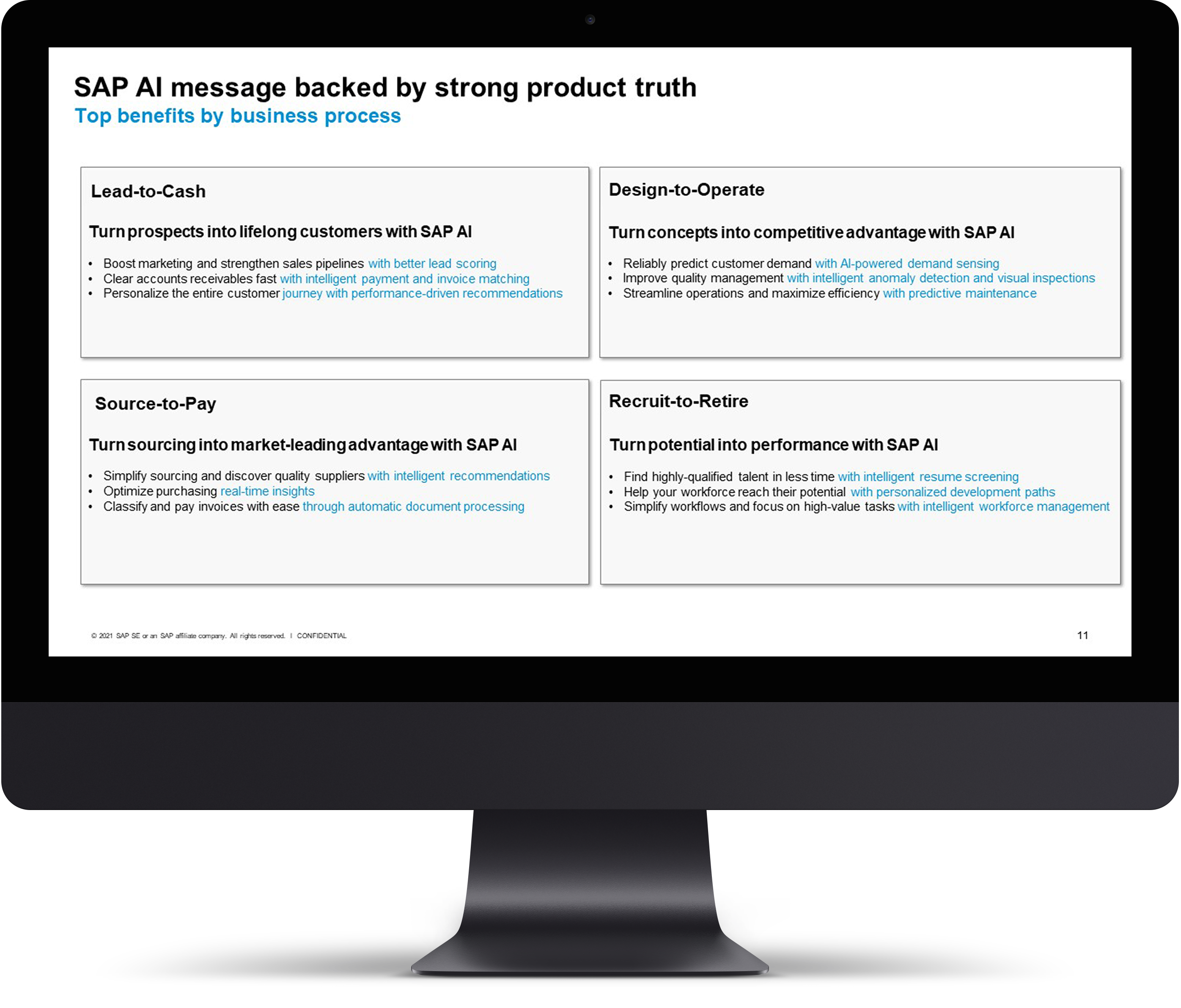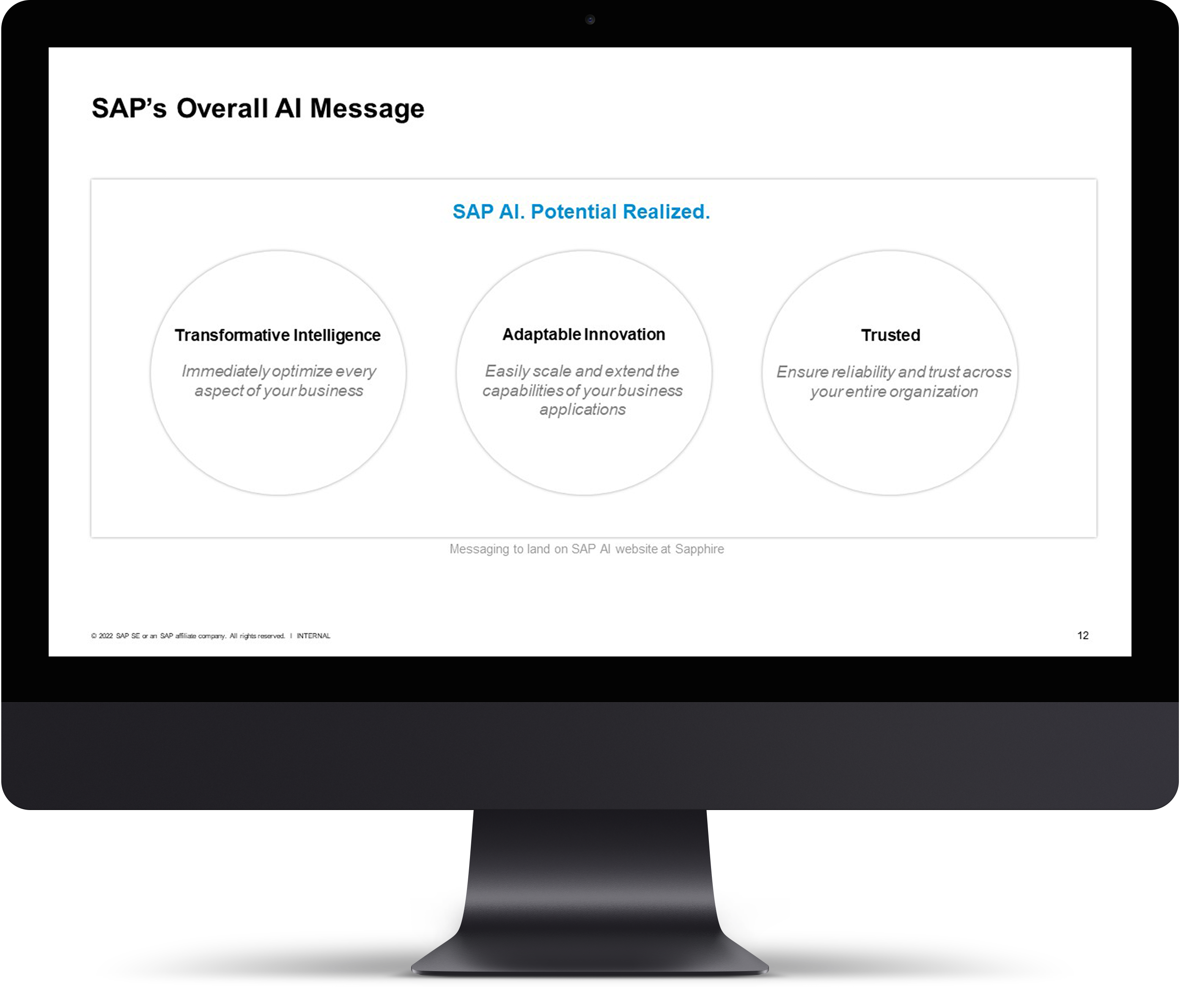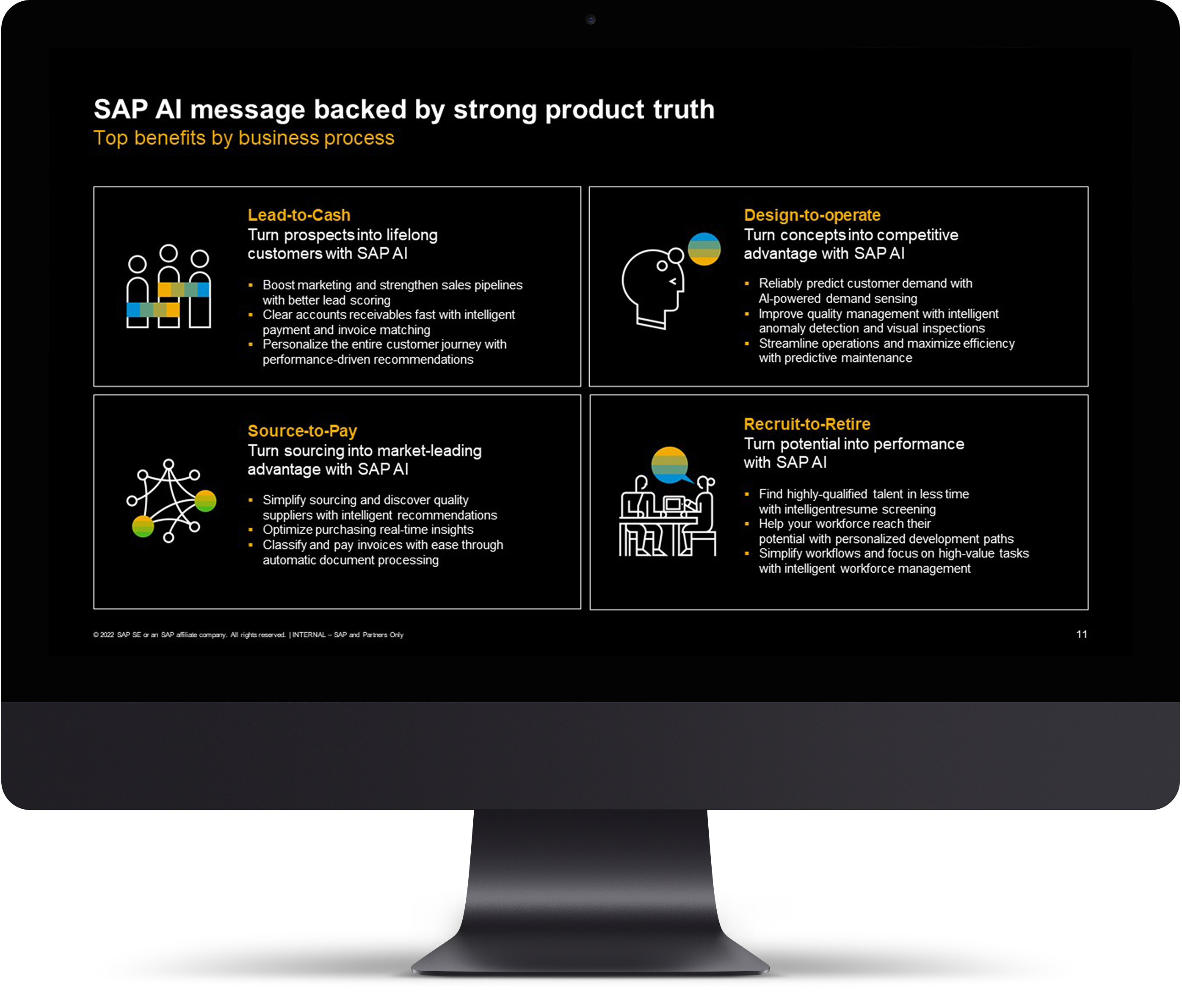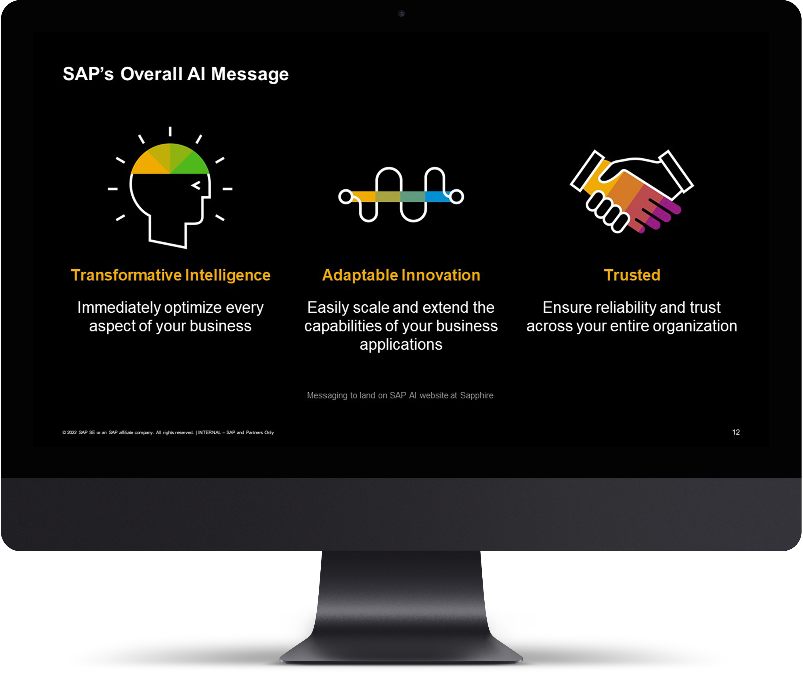 We regularly design presentations for SAP. They come to us with a rough deck, and within a quick turnaround, we polish it, clean up the visuals and messaging as needed. This is one example of that effort.